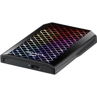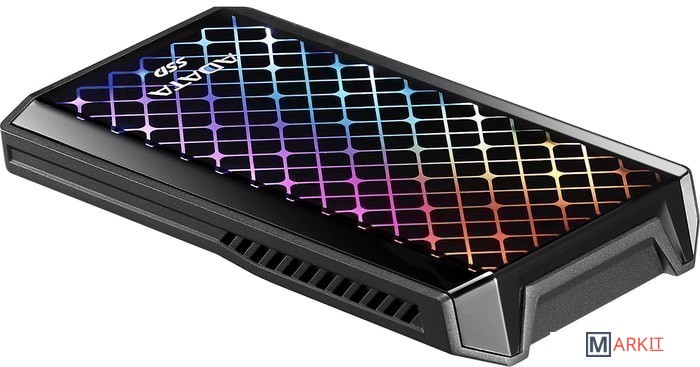 Накопитель оснащен RGB панелью, которая занимает 74% передней крышки устройства.